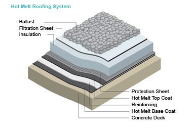 - Essentially Hot Melt is a ‘protected system’ and is therefore ideal for use as part of an Inverted or Green Roof design. Most manufacturers offer complete packages for these options.